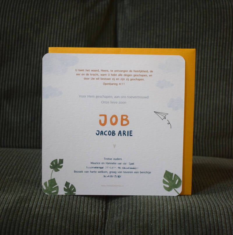 Voor Job's geboorte ontwierp ik deze kaart met afgeronde hoeken. De monstera is een knipoog naar alle stekjes die afkwamen van de familieplant. En het vliegtuigje mocht erop als fijne herinnering aan de reisjes die Hanneke en Maurice samen maakten.