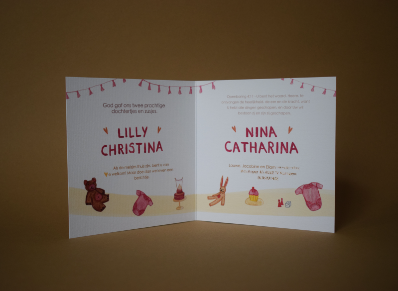 Het tweede kaartje wat ik mocht ontwerpen voor een tweeling! En weer voor twee lieve nichtjes. De geboortekaart van hun broer maakte ik ook. Het werd weer een familieportret, zittend op de grond. En lekker spelletjes doen en taart eten.