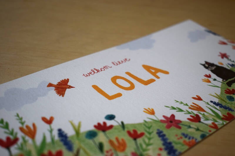 Op Lola's geboortekaart mochten veel bloemen! En tussen deze fleurigheid kwam de zijspan van haar vader.