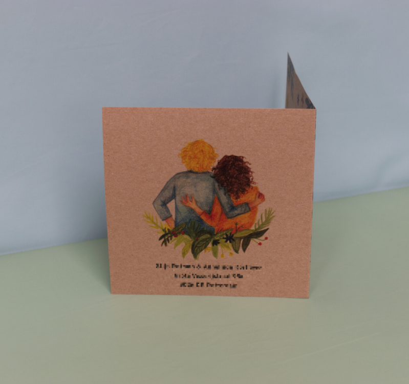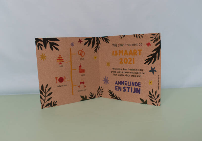 Voor de bijzondere dag voor Stijn en Annelinde mocht ik de trouwkaart ontwerpen! Het aanstaande bruidspaar koos voor een trouwkaart van kraftpapier. Dit was een leuke uitdaging! De kleuren pakken heel anders uit dan op wit papier, en het was leuk om hiermee te spelen. Bloemen, planten en een tijdlijn waren dingen die ze graag terug wilden zien op de kaart. En op de achterkant kwam een portret van de achterzijde. Proost op dit leuke stel!
