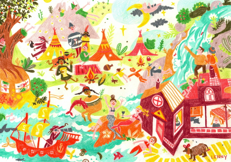 Een bron van inspiratie voor mij zijn sprookjes en verhalen. James Matthews 'Peter Pan', herschreven door Disney, was de inspiratie voor deze kijkplaat. Met het maken van kijkplaten en zoekplaten ga ik als volgt te werk. Eerst bedenk ik wat thema's die ik in de plaat wil terug zien. Dat doe ik door informatie op te zoeken, een plaatje in mijn hoofd te schetsen of te luisteren naar een vertelling over het verhaal. Ik maak mijn kijkplaten zonder te schetsen. Op het witte papier begin ik een stuk kleur te geven, en gaandeweg groeit het verhaal steeds verder.